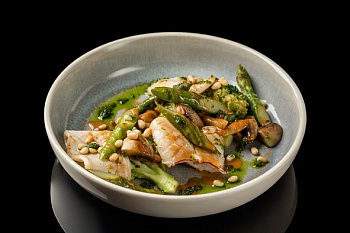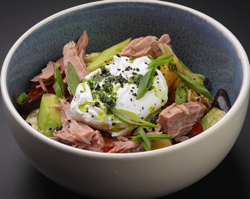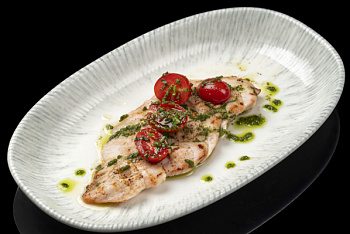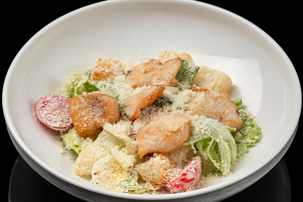 Классический салат с обжаренным цыпленком, листьями салатов романа и айсберг, томатами черри, перепелиным яйцом и классической заправкой на основе домашнего соуса и анчоусов.