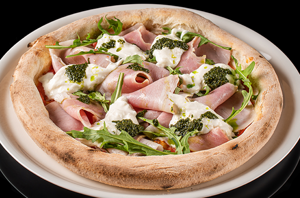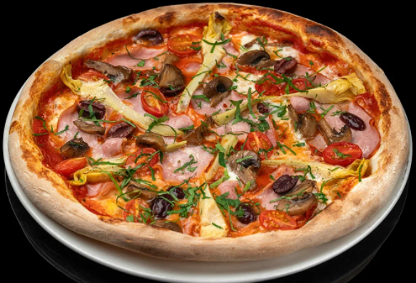 Пикантная ветчина и ароматы свежих шампиньонов, готовых раскрыть все свои землистые ноты, нежный артишок, с оливковым маслом, добавляющий лёгкую горечь и свежесть, ароматные оливки, придающие блюду морской характер и яркую цветовую палитру.