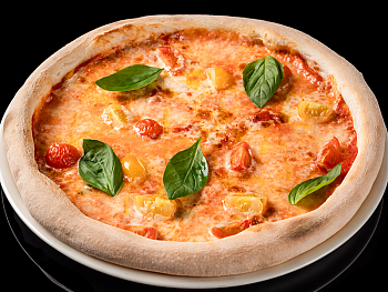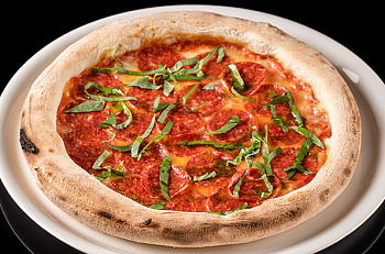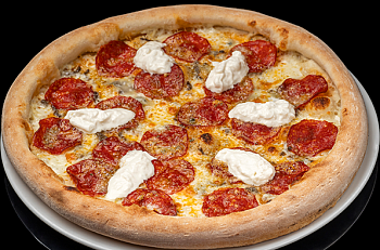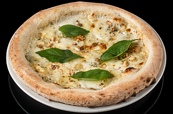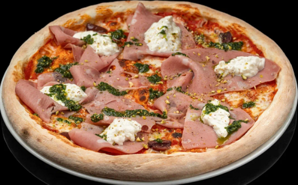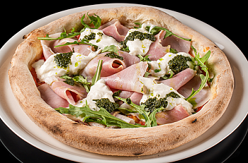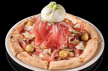 Тонкое тесто с воздушными бортами, начинка из пармы, зеленых оливок, хлопьев пармезана и сыра буррата. Подача при доставке будет отличаться от фотографии
