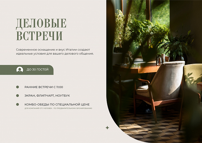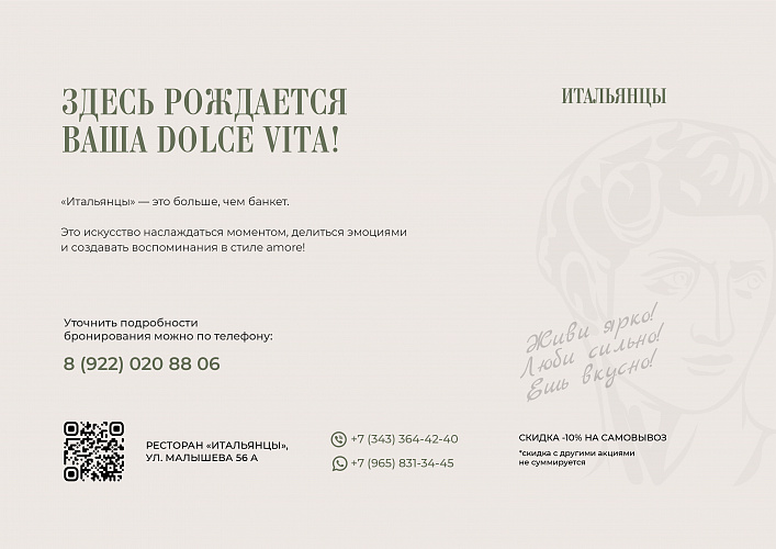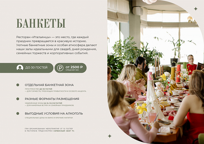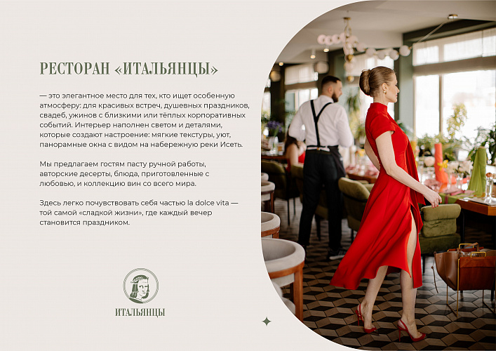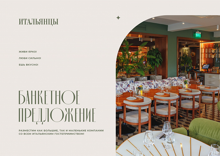 Ресторан ИТАЛЬЯНЦЫ — это дух Италии. Мы готовы разместить и как большие, так и маленькие компании со всем итальянским гостеприимством.