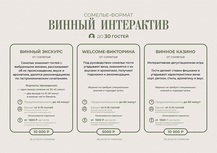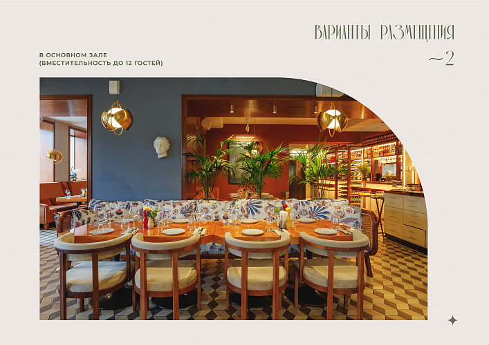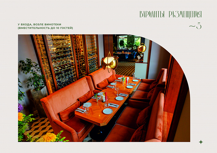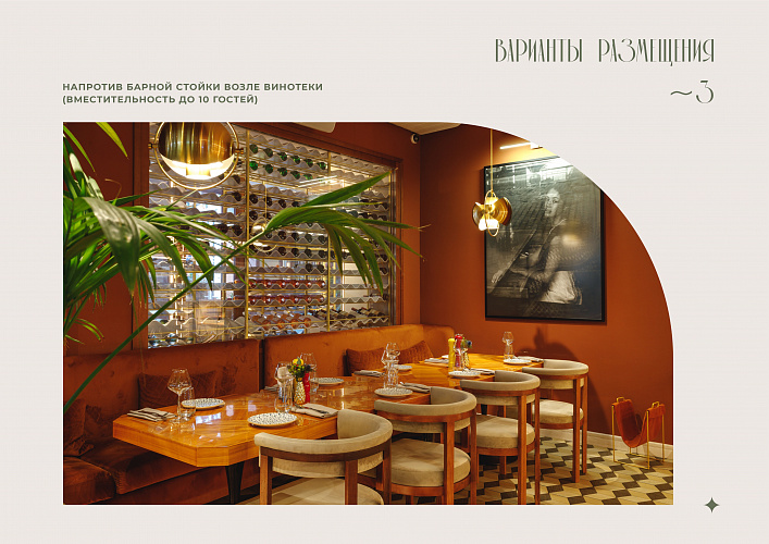- напротив барной стойки возле винотеки (вместительность до 10 гостей);