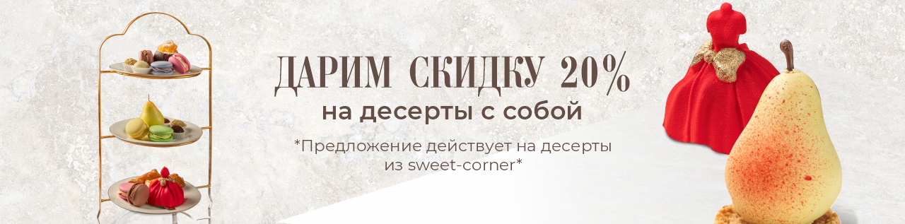 Для вас sweet-corner более чем с 20 авторскими десертами, которые Вы можете взять с собой или насладиться ими в ресторане.