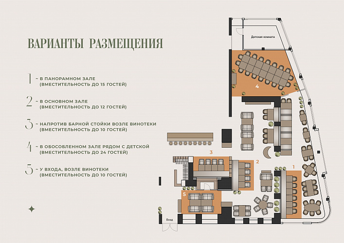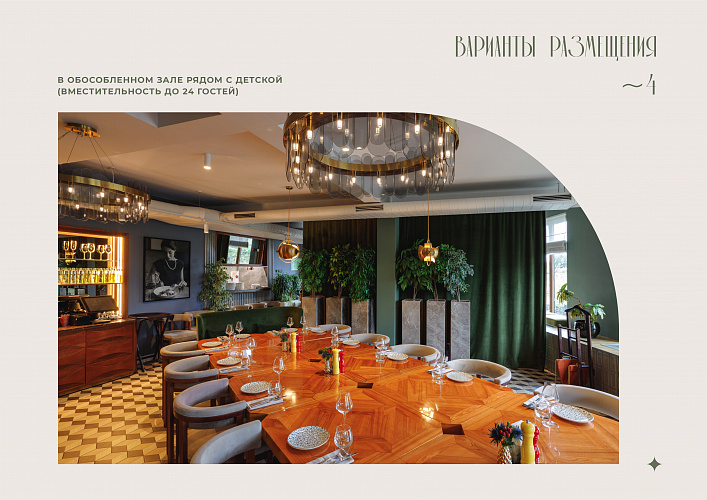 - в обособленном зале рядом с детской (вместительность до 24 гостей).