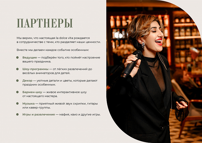 Ресторан ИТАЛЬЯНЦЫ — это дух Италии. Мы готовы разместить и как большие, так и маленькие компании со всем итальянским гостеприимством.